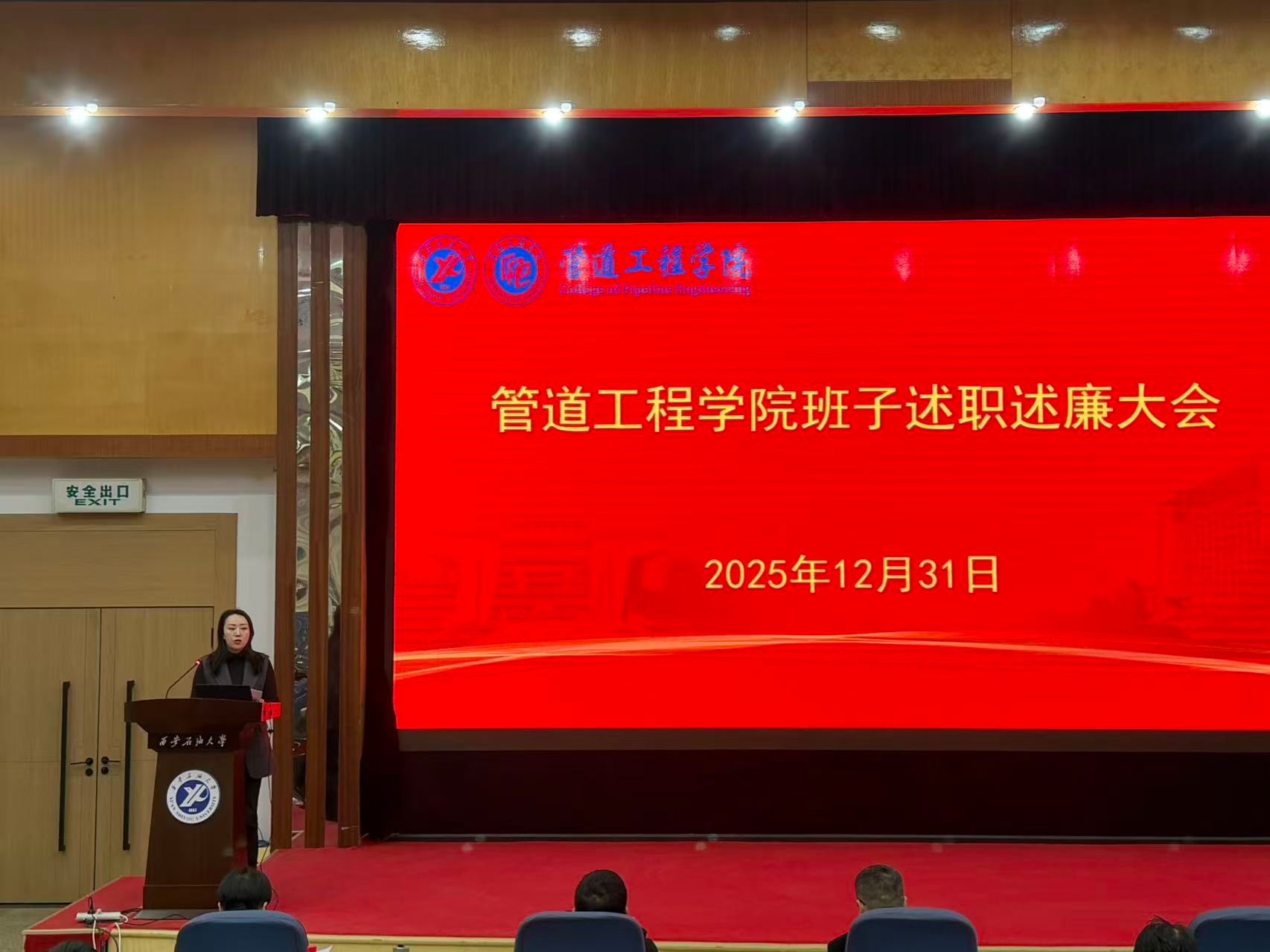 2025年12月31日,管道工程學(xué)院在雁塔校區(qū)學(xué)術(shù)報(bào)告廳召開2025年度中層領(lǐng)導(dǎo)班子和處級(jí)干部述職述廉大會(huì),會(huì)議由學(xué)院黨委書記賈莉娜主持,學(xué)院全體教職工參會(huì)。
