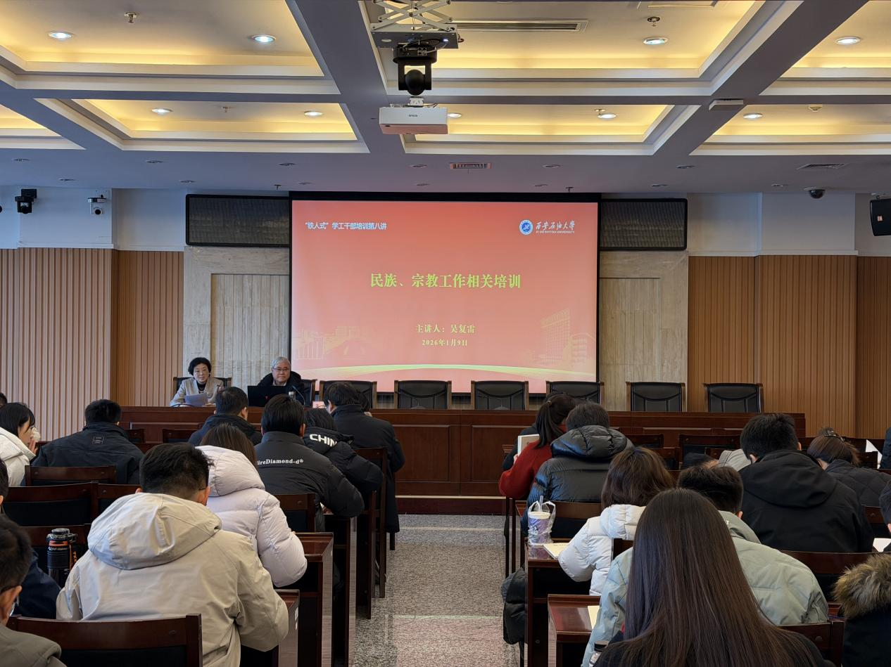 為進(jìn)一步加強(qiáng)學(xué)工干部隊(duì)伍建設(shè),提升我校民族宗教工作規(guī)范化水平,筑牢校園意識形態(tài)安全防線,1月9日上午,我校“鐵人式”學(xué)工干部培訓(xùn)第八講在鄠邑校區(qū)圖書館第一會議室舉行。校黨委委員、黨委統(tǒng)戰(zhàn)部部長吳復(fù)雷以《加強(qiáng)鑄牢中華民族共同體意識教育、堅(jiān)持我國宗教中國化、做好學(xué)校民族宗教工作》為題作專題輔導(dǎo)報(bào)告。學(xué)生工作部副部長畢軼慧主持培訓(xùn)會,黨委統(tǒng)戰(zhàn)部、黨委學(xué)生工作部、研究生工作部、團(tuán)委及各院(系)學(xué)工干部100余人參加培訓(xùn)。