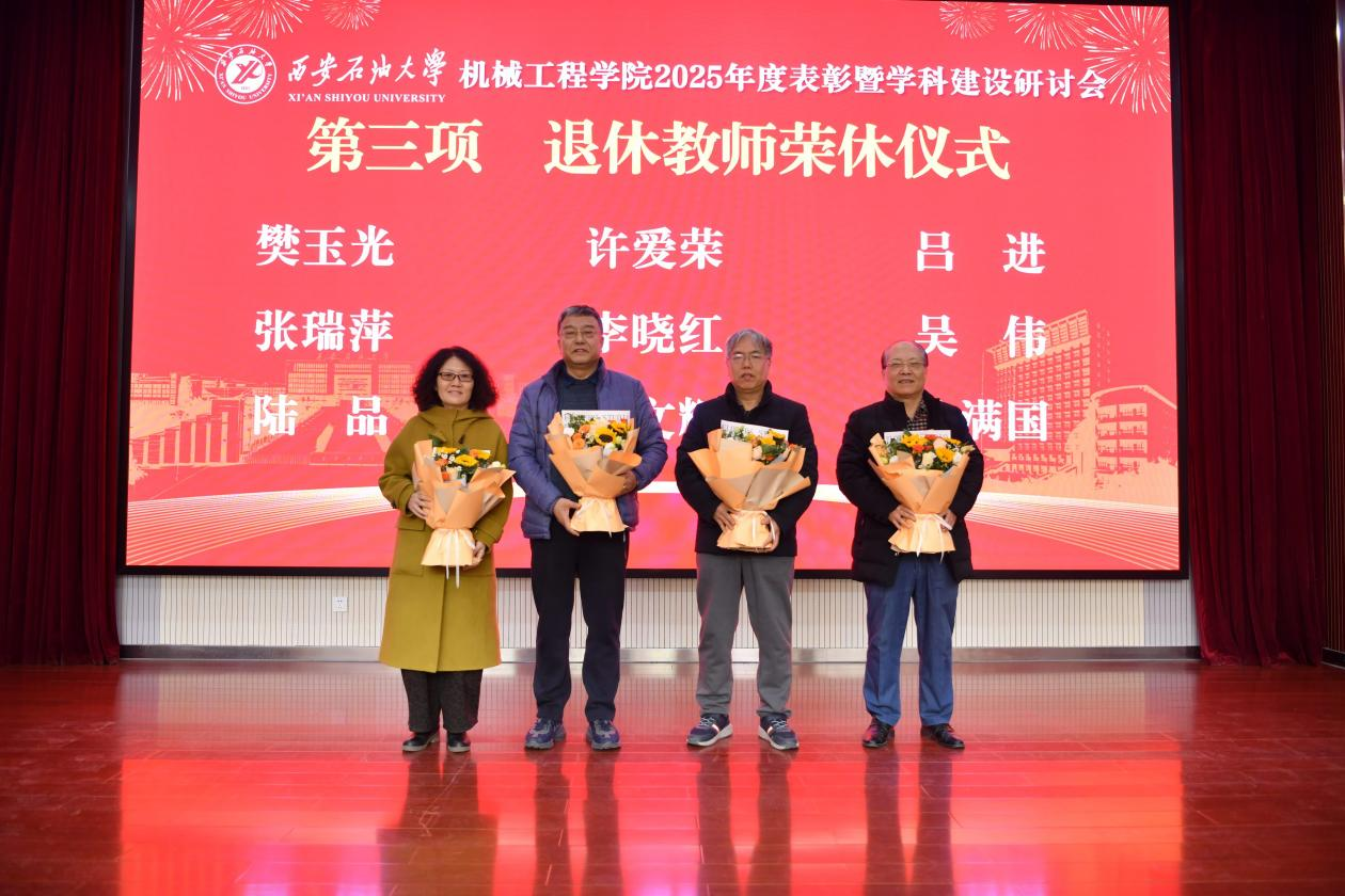 會(huì)議對(duì)2025年度在科學(xué)研究、教學(xué)改革、社會(huì)服務(wù)、學(xué)科競(jìng)賽指導(dǎo)等方面表現(xiàn)突出的集體和個(gè)人進(jìn)行了表彰。趙健副校長(zhǎng)為省級(jí)創(chuàng)新團(tuán)隊(duì)和省級(jí)人才稱號(hào)獲得者頒獎(jiǎng),校學(xué)術(shù)委員會(huì)副主任委員、國(guó)務(wù)院特殊津貼專家竇益華為獲批國(guó)家級(jí)項(xiàng)目負(fù)責(zé)人頒獎(jiǎng),教務(wù)處副處長(zhǎng)陳國(guó)祥為國(guó)家一流課程教學(xué)團(tuán)隊(duì)、陜西省研究生教育綜合改革研究與實(shí)踐項(xiàng)目團(tuán)隊(duì)頒獎(jiǎng),科技處副處長(zhǎng)屈樂(lè)為獲得中國(guó)商業(yè)聯(lián)合會(huì)科技進(jìn)步一等獎(jiǎng)、中國(guó)發(fā)明協(xié)會(huì)發(fā)明創(chuàng)業(yè)成果二等獎(jiǎng)等科研成果獲獎(jiǎng)團(tuán)隊(duì)頒獎(jiǎng),人事處副處長(zhǎng)張?jiān)谱藶槟甓葯C(jī)械工程學(xué)院考核優(yōu)秀個(gè)人頒獎(jiǎng)。
