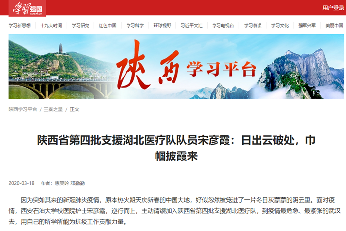 因為突如其來的新冠肺炎疫情,原本熱火朝天慶新春的中國大地,好似忽然被攏進了一片冬日灰蒙蒙的陰云里。面對疫情,西安石油大學校醫(yī)院的宋彥霞護士,逆行而上主動請纓加入陜西省第四批援鄂醫(yī)療隊,到疫情最危急、最緊張的武漢去,用自己的所學所能為抗疫工作貢獻力量。