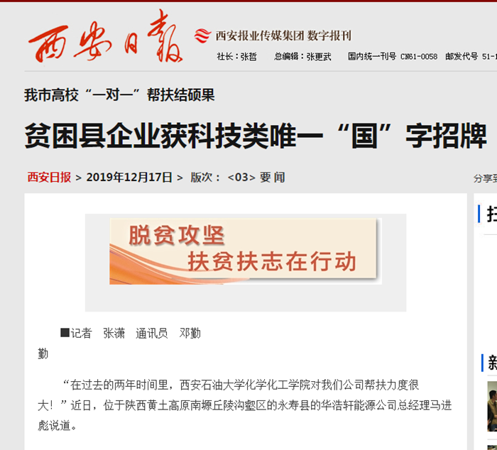 【西安日?qǐng)?bào)】西安石油大學(xué)“一對(duì)一”幫扶結(jié)碩果貧困縣企業(yè)獲科技類(lèi)唯一“國(guó)”字招牌