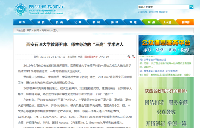 2019年9月份公布的ESI數(shù)據(jù)庫顯示,西安石油大學(xué)老師尹帥的一篇論文成功入選地質(zhì)學(xué)領(lǐng)域TOP1%高被引論文,一年內(nèi)被引頻次達(dá)到9次。