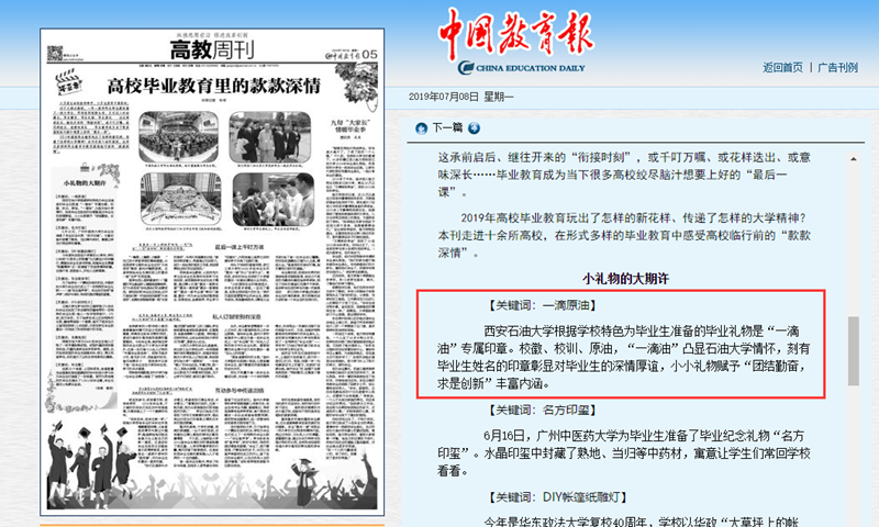 7月8日,《中國教育報》高教周刊的文章《高校畢業(yè)教育里的款款深情》,對我校的畢業(yè)禮物“一滴油”印章進行了報道。文章寫到,西安石油大學根據(jù)學校特色為畢業(yè)生準備的畢業(yè)禮物是“一滴油”專屬印章。?;铡⑿S?、原油,“一滴油”凸顯石油大學情懷,刻有畢業(yè)生姓名的印章彰顯對畢業(yè)生的深情厚誼,小小禮物賦予“團結(jié)勤奮,求是創(chuàng)新”豐富內(nèi)涵。