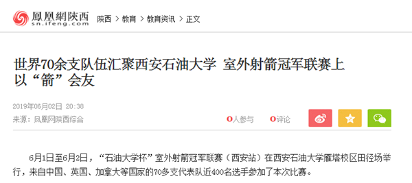 6月1日至2日,“石油大學杯”室外射箭冠軍聯(lián)賽(西安站)在西安石油大學雁塔校區(qū)田徑場舉行,來自中國、英國、加拿大等國家的70多支代表隊近400名選手參加了本次比賽。