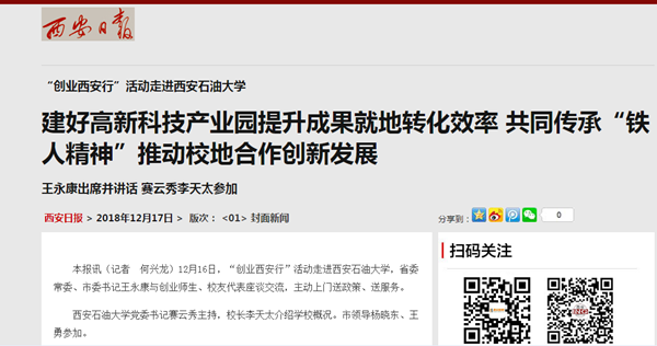 王永康說,西安石油大學是石油石化行業(yè)特色鮮明的高水平大學,“鐵人精神”傳承得好,創(chuàng)新創(chuàng)業(yè)成效明顯,為國家、西部、西安輸送了大量優(yōu)秀人才。西安將全力支持學校建設,建好高新科技產業(yè)園,推動校地合作創(chuàng)新發(fā)展。