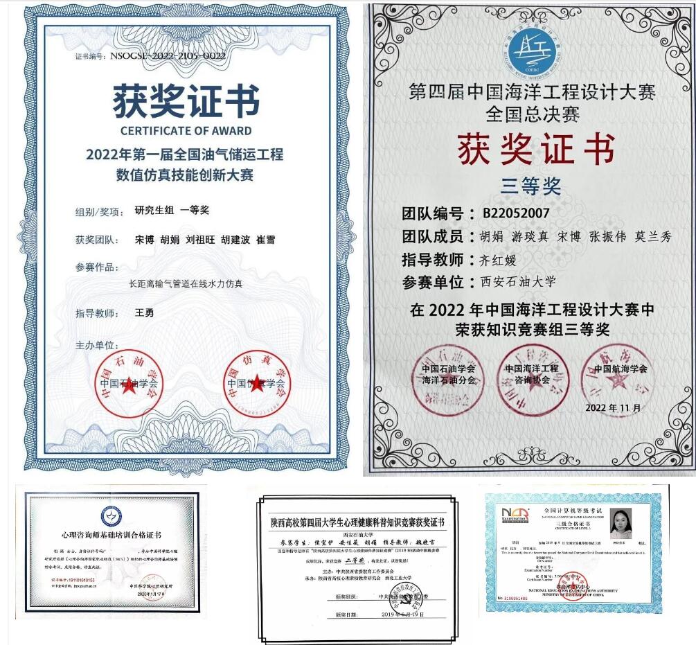 研究生期間,曾獲一等學(xué)業(yè)獎(jiǎng)學(xué)金,被評(píng)為優(yōu)秀黨員、陜西省自強(qiáng)之星標(biāo)兵。曾獲第一屆全國油氣儲(chǔ)運(yùn)工程數(shù)值仿真技能創(chuàng)新大賽研究生組一等獎(jiǎng)、第四屆中國海洋工程設(shè)計(jì)大賽全國總決賽知識(shí)競(jìng)賽組三等獎(jiǎng)等獎(jiǎng)項(xiàng)。