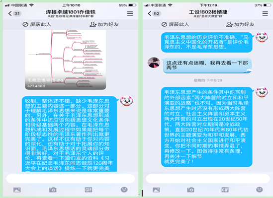 授課中,按照教學(xué)規(guī)劃,她精心選擇和使用教學(xué)案例。如對毛澤東思想主要內(nèi)容的學(xué)習(xí)時,除指導(dǎo)學(xué)生完成教材內(nèi)容的學(xué)習(xí)外,結(jié)合當(dāng)前的國家局勢,特別增加了毛澤東在1949814日到916日發(fā)表的五篇文章,讓學(xué)生通過對文獻的閱讀,進一步思考毛澤東的論述對當(dāng)今處理中美關(guān)系的啟示。授課中采用“學(xué)習(xí)通+群課堂”的教學(xué)模式,學(xué)生在學(xué)習(xí)通完成基本知識點的學(xué)習(xí),群課堂完成教學(xué)重難點的講解,將學(xué)生的自主學(xué)習(xí)和教師的主導(dǎo)性相結(jié)合,增強了師生互動。授課中還通過設(shè)定靈活多樣的討論題,激發(fā)學(xué)生的思考。如學(xué)完毛澤東思想的內(nèi)容,讓學(xué)生結(jié)合所學(xué)內(nèi)容,談?wù)勑哪恐械拿珴蓶|;如看完教育部社科司組織的“疫情防控思政大課”讓學(xué)生談?wù)勛约旱捏w會。通過與學(xué)生的互動交流,逐步引導(dǎo)學(xué)生要用“四個自信”明心立志,引導(dǎo)學(xué)生把愛國情、強國志、報國行融入新時代的追夢征程中。