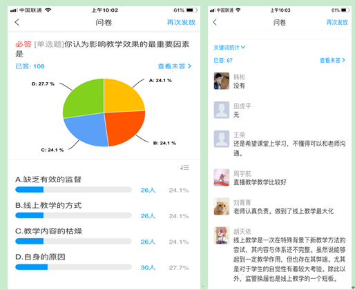 授課中郭艷英老師隨時關(guān)注學(xué)生。根據(jù)兩周線上教學(xué)的在線調(diào)查,郭老師依據(jù)學(xué)生的反饋及時調(diào)整自己的教學(xué)方法。如51%的學(xué)生認為影響教學(xué)效果的重要因素為缺乏有效監(jiān)督和自身原因時,郭老師采用了隨機抽查的方式加大督查力度,針對自律性特別差的同學(xué),采用打電話、發(fā)QQ等方式提醒督促,保證不讓一個學(xué)生掉隊。