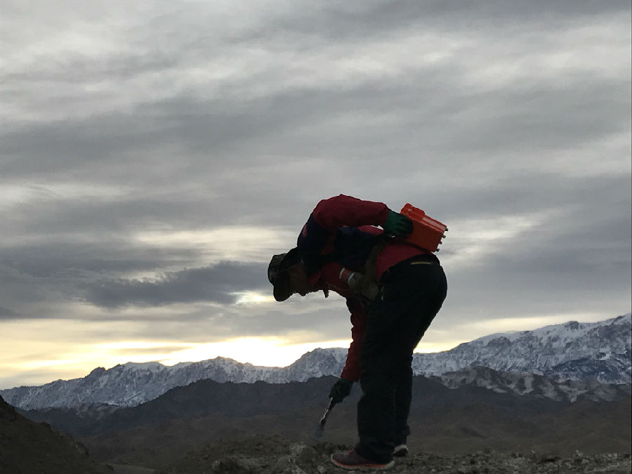 2014年是他工作的第一年,7、8月份的新疆哈密戈壁灘上正是烈日炙烤大地正旺的時候,熱浪滾滾,沙子都可以把雞蛋燙熟。他和隊友頭頂著炎炎烈日,踏著灼熱砂礫,扛著重力儀攀爬一個又一個沙丘。日出而作,在無垠的戈壁中一次一次按下儀器按鍵,餓了啃口饅頭,渴了喝口白開水。完成一天的野外工作任務,輾轉回到項目駐地,已是晚上8點,日頭還是那么毒,汗水已經(jīng)把衣服浸透了,第一次出野外的他開始想念家人。